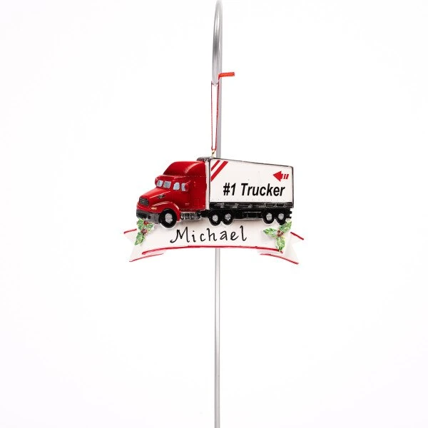 Thank the truck driver in your life with this “#1 Trucker” Ornament. Each ornament has a red and white banner that can be written on for personalization.