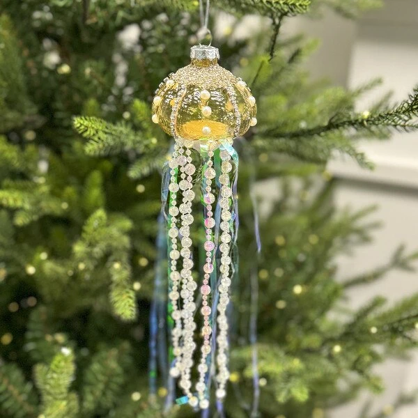 This assortment of glass jelly fish features each with white and pink tentacles, one with an amber head and the other with a green head. Each sold separately.