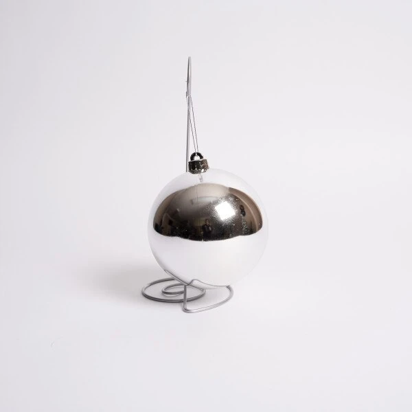This box of 2 silver ball ornaments are made of shatterproof plastic and measures 5.51 inches.