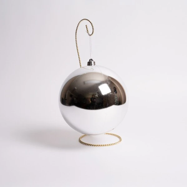 This silver ball ornament is made of shatterproof plastic and measures 7.87 inches.