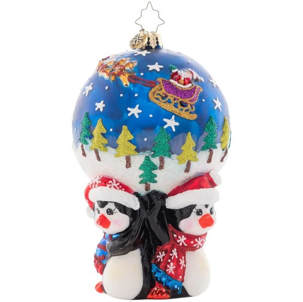 Santa and his sleigh are scene up above, the penguins are assisting each other with brotherly love. This 2023 Christopher Radko glass ornament measures 5.5 inches in height.