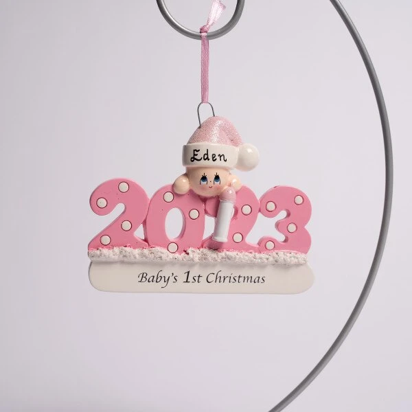 This ornament features the manufactured year 2023 and the words “Baby’s First Christmas” and is colored in pink. It can be personalized and measures 3.25 inches in height.