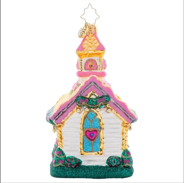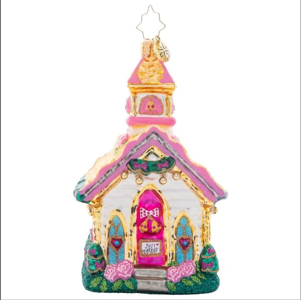 A cute little wedding chapel to remind couples of the best day of the rest of their lives. This 2023 Christopher Radko glass ornament measures 5.5 inches in height.
