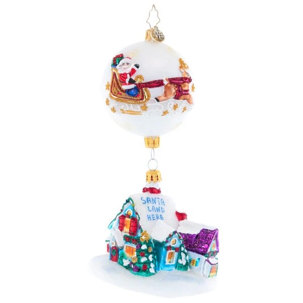 Santa in his sleigh and reindeer in flight, looks down below to see a message in sight. This 2023 Christopher Radko glass ornament measures 7 inches in height.