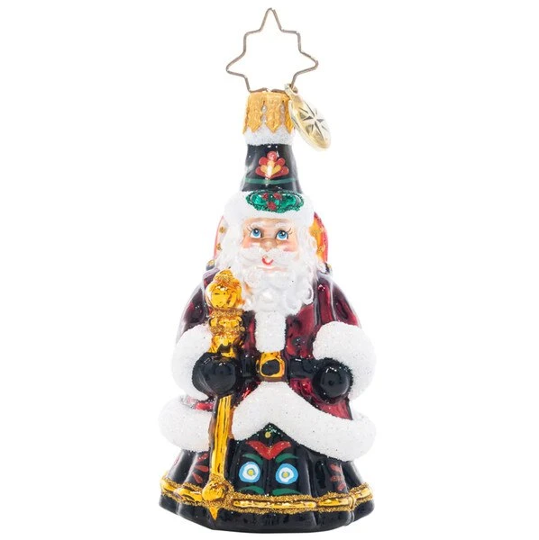 Santa is wearing his festive attire, preparing to attend the holiday festivities. This 2023 Christopher Radko glass gem ornament measures 3 inches in height.