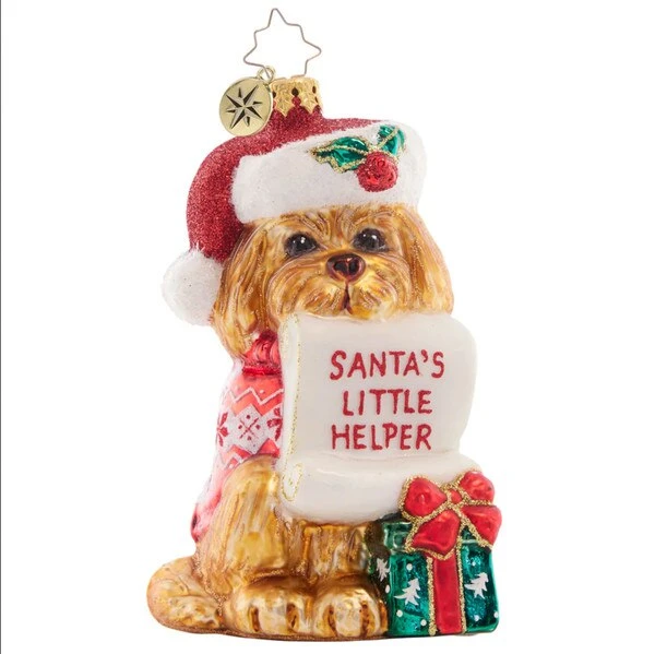 Santa has a little helper and its a special furry friend, he knows he will always be around and on him he can depend. This 2023 Christopher Radko glass ornament measures 5.75 inches in height.