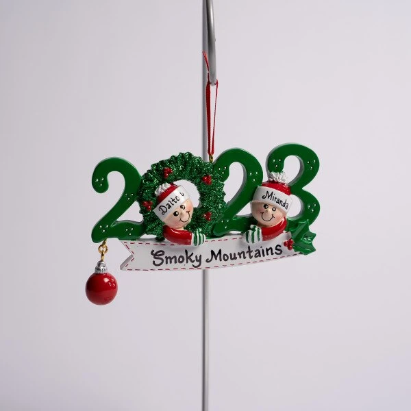 This ornament features a couple celebrating Christmas with the manufactured year 2023. It can be personalized and measures 2.25 inches in height.