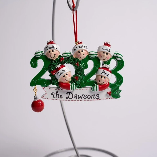 This ornament features a family of 5 celebrating Christmas with the manufactured year 2023. It can be personalized and measures 2.25 inches in height.