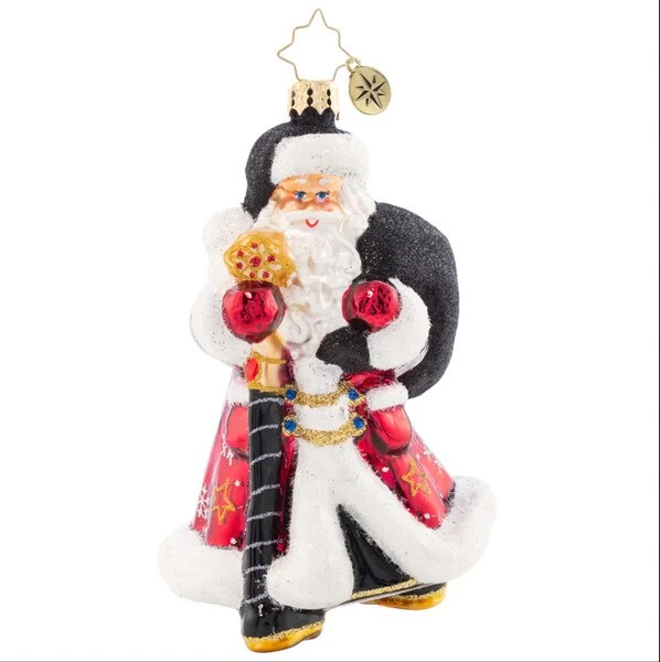 Dressed in red with black accents, Santa is carrying a golden staff with jewel tones. This 2023 Christopher Radko glass ornament measures 5 inches in height.