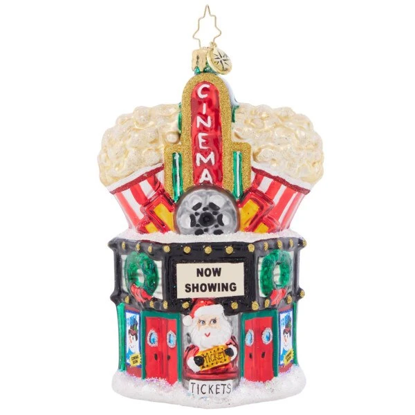 Santa and the Snowmen are coming to a theater near you, with tickets in hand Santa is going in for a view. This 2023 Christopher Radko glass ornament measures 5.25 inches in height.