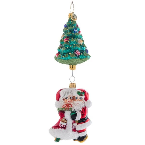 The Christmas tree hanging from ceiling above, Santa and the misses are twirling in love. This 2023 Christopher radko glass ornament measures 8 inches in height.