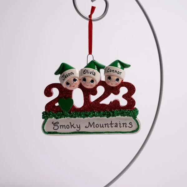 This ornament features the manufactured year 2023 in red and a family of 3 on top. It can be personalized and measures 3.25 inches in height.