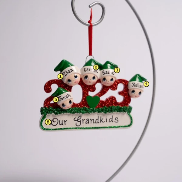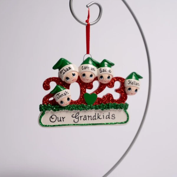 This ornament features the manufactured year 2023 in red and a family of 5 on top. It can be personalized and measures 3.25 inches in height.