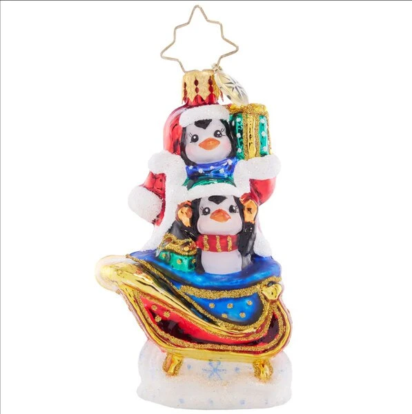 The penguins are feeling a little bit silly, so they jumped in the sleigh to go for a ride. This 2023 Christopher Radko glass gem ornament measures 3.5 inches in height.