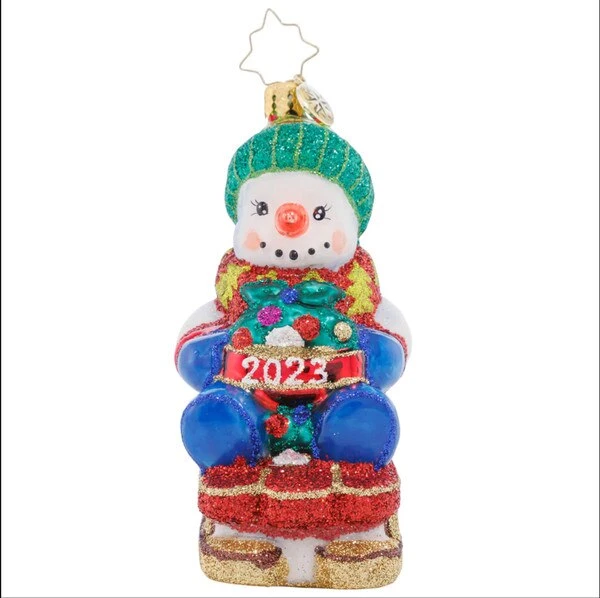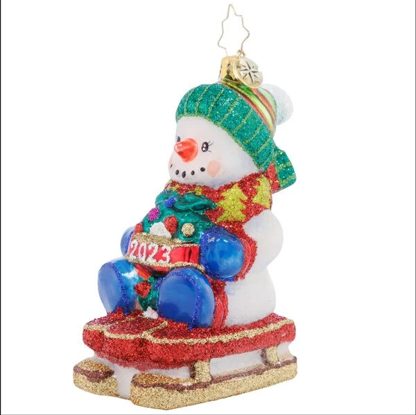 The snowman is sleighing down hill on a sled, holding a ribbon for a new year 2023 it said. This dated 2023 Christopher Radko glass ornament measures 4.25 inches in height.
