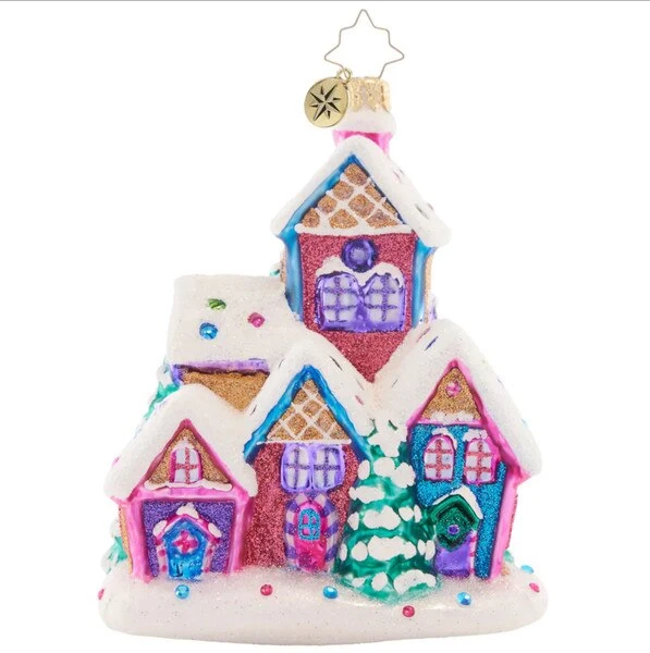 The cottage is covered by candy galore, with snow underneath to keep it icy cold. This 2023 Christopher Radko glass ornament measures 5.5 inches in height.
