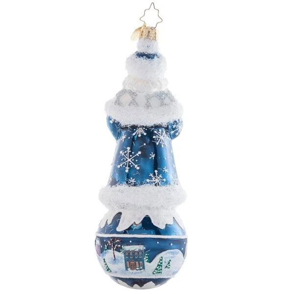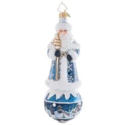 Dressed in blue and covered in snow, Santa has a view of the houses below. This 2023 Christopher Radko glass ornament measures 6 inches in height.