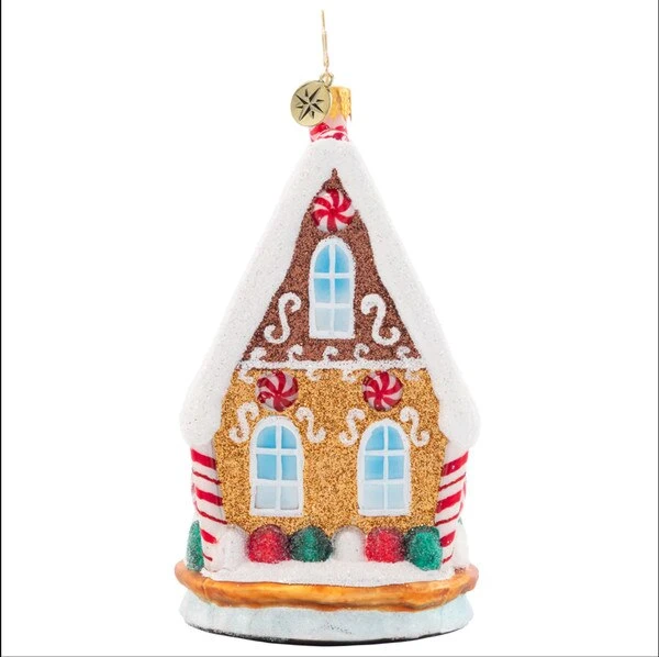A gingerbread chalet is already sweet, but this one is loaded with candy and treats. This 2023 Christopher Radko glass ornament measures 4.5 inches in height.