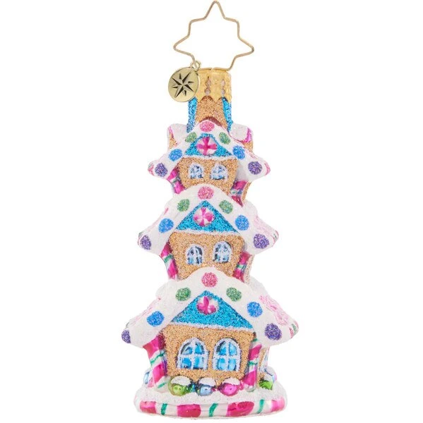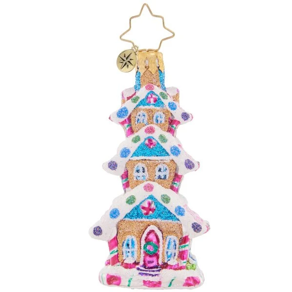 The three story high rise with a gingerbread base, has lots of candy to add to the taste. This 2023 Christopher Radko glass gem ornament measures 3.5 inches in height.