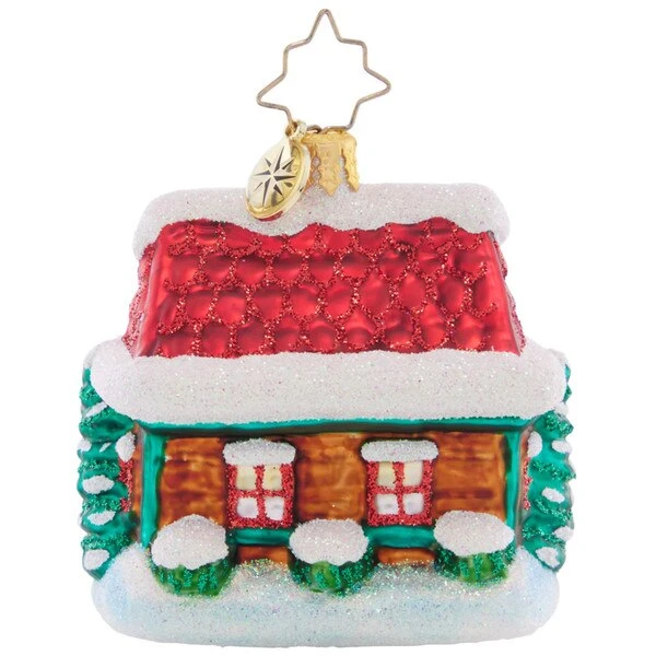 A cozy little cottage set out in the forest, a perfect vacation spot decorated for Christmas. This 2023 Christopher Radko glass gem ornament measures 3 inches in height.