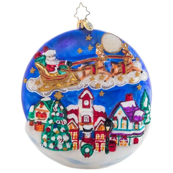 Santa in the sleigh and the reindeer in flight, all of the presents will be delivered tonight. This 2023 Christopher Radko glass ornament measures 5 inches in height.