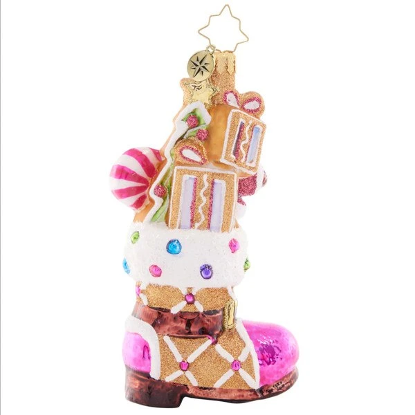 A boot that is stuffed with presents and more, Santa in the mix of candy galore. This 2023 Christopher Radko glass ornament measures 5 inches in height.