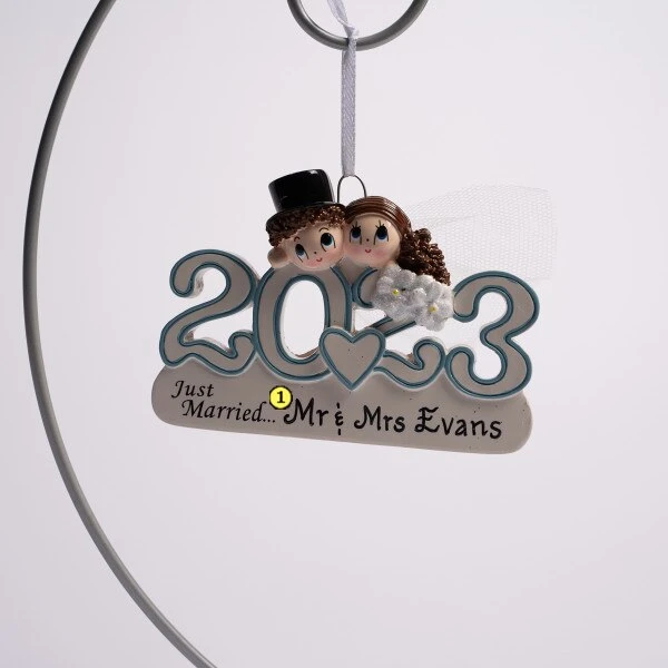 This ornament features the manufactured year 2023 with a couple on top and the words “Just Married” underneath. It can be personalized and measures 3 inches in height.