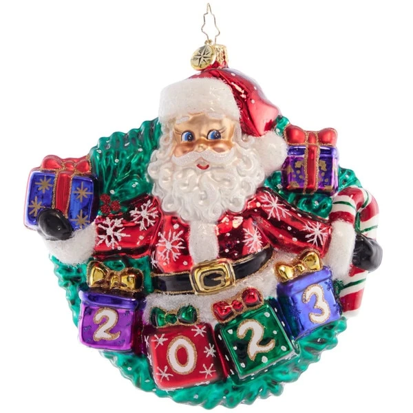 Yearly salutations from Santa in a wreath, the best year of all 2023. This 2023 Christopher Radko glass ornament measures 6 inches in height.