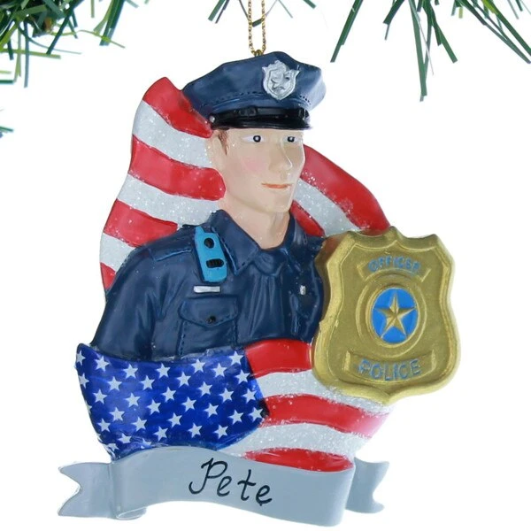 This ornament features a policeman in uniform surrounded by the American flag and a gold “Officer Police” shield with a white banner that can be written on. Made of quality resin and measures 3.75in H x .5in W x 3in L.