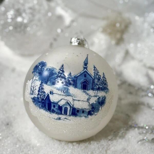 Beautiful gloss white glass ball ornament in an assortment of two having a Delft winter estate scene; one has a house and a church and the other a farm (each sold separately). Measures 5 inches in diameter.