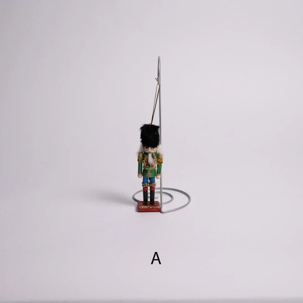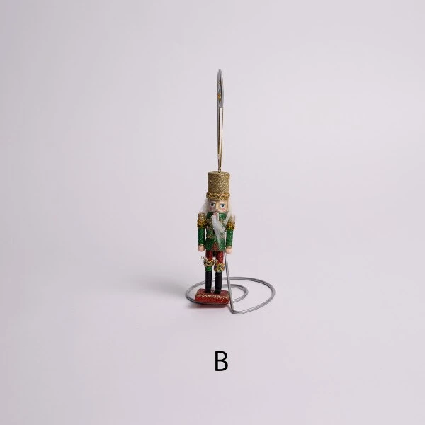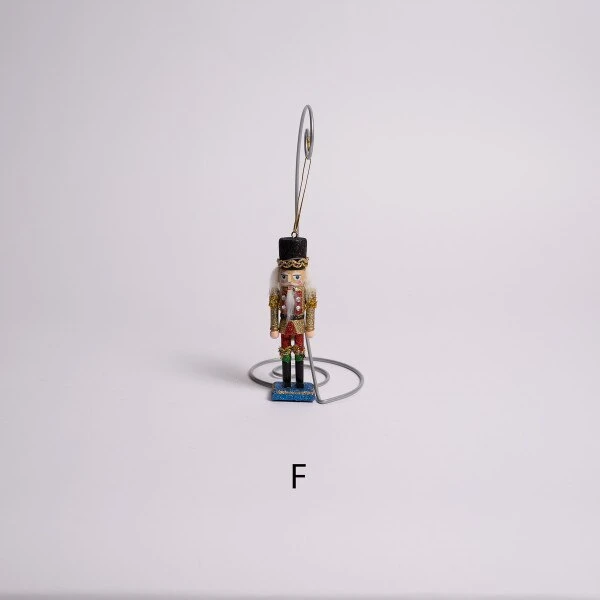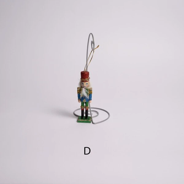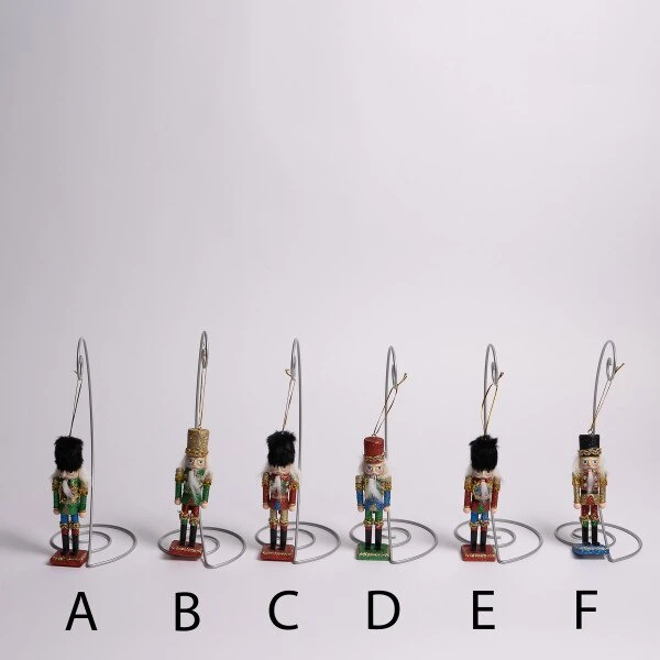 This assortment of nutcracker ornaments has six different outfits which include a black faux fur hat with a green coat, a black faux fur hat with a red coat, a glittery red hat with a blue coat, a black faux fur hat with a red coat and a glittery black hat with a gold coat. Each sold separately and measures 5 inches in height.