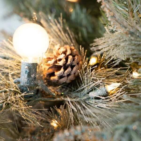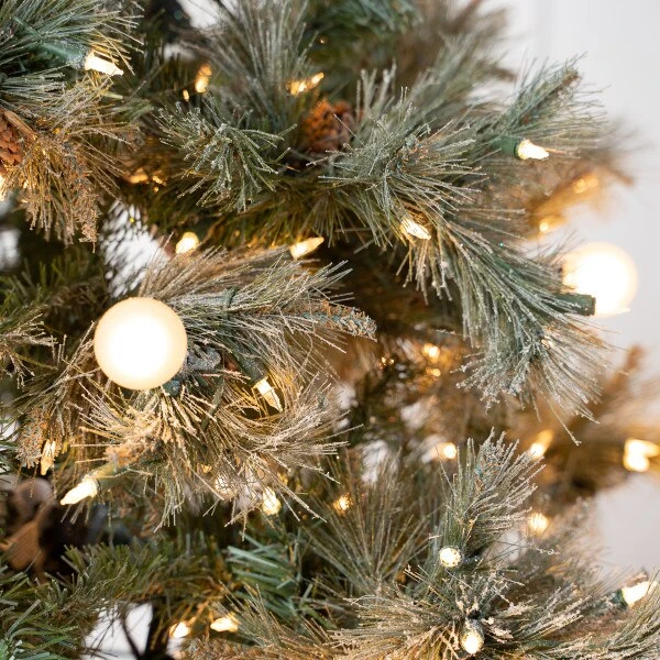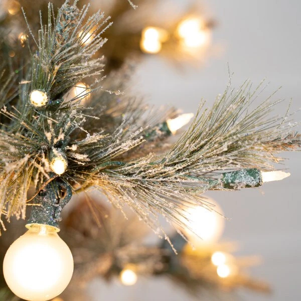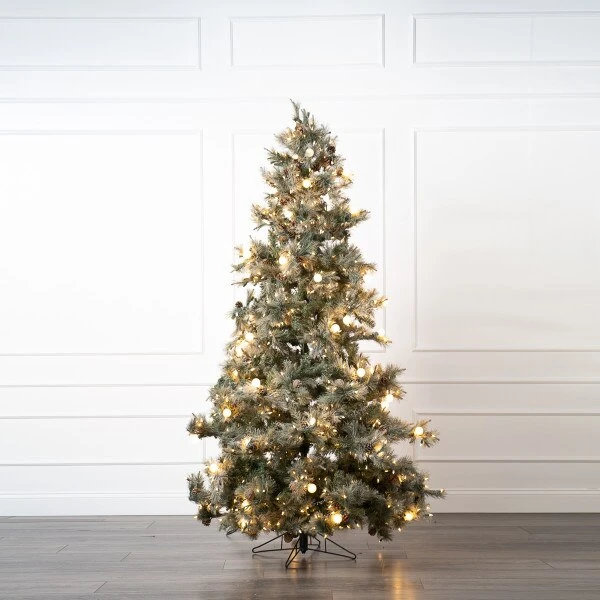 This beautiful flocked tree is 7.5 feet tall, has 850 warm white LED lights, 1,438 tips, and a 59″ diameter.