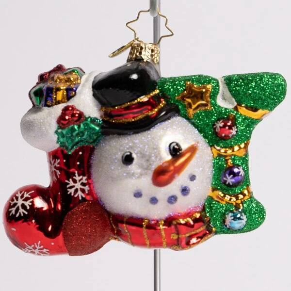 Let this snowman bring joy to your holidays. J is a stocking and the snowman is the O, the Y is a tree to spell JOY on the go. This Radko glass ornament measures 2.75 inches in height.