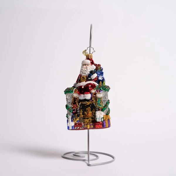 Santa on the mantle and presents all around, I wonder what goodies under the tree will be found. This Christopher Radko glass ornament measures 5 inches in height.
