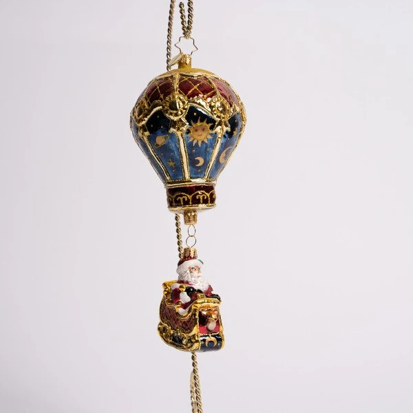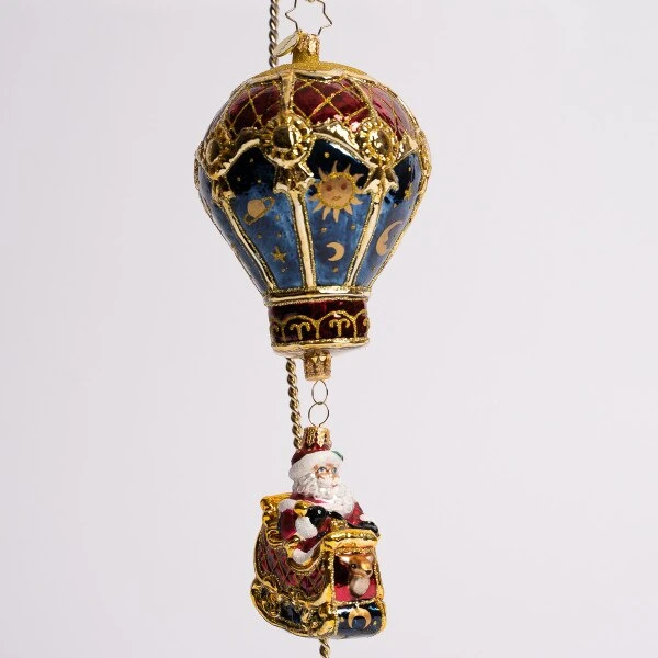 Santa is traveling in his hot air balloon, decorated in style with sun, stars, and moon. This Christopher Radko glass ornament measures 8 inches in height.