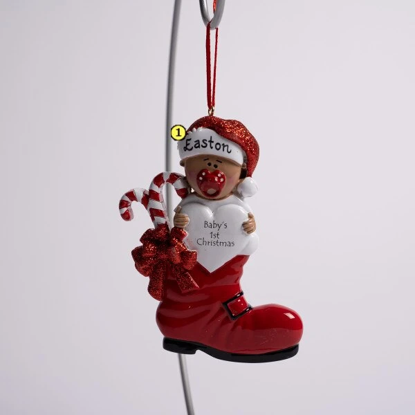 This ornament features an African American baby in a boot with the words “Baby’s First Christmas”. It can be personalized and measures 4 inches in height.
