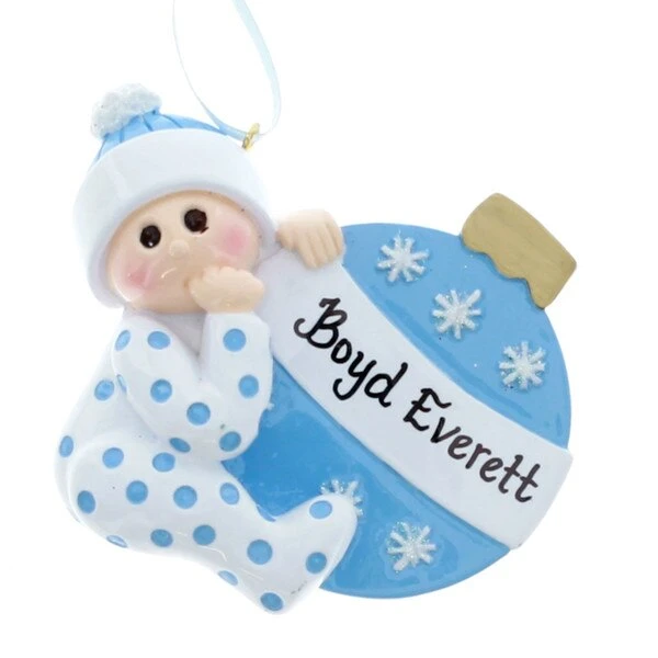With his polka dot pajamas and cute blue beanie, this baby boy is setting next to a blue ornament. Personalization available on this resin ornament. The measurements are 3.38 x .25 x 3.25 and weighs .14 pounds.