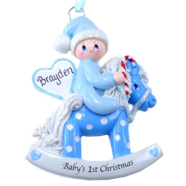 An adorable personalizable ornament of a baby boy in blue riding his blue and white polka dot rocking horse and holding a candy cane. The rocker is preprinted “Baby’s 1st Christmas”. Made of quality resin and measures 4in H x 3.25in W x .25in D.