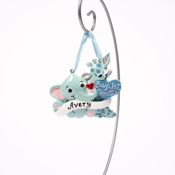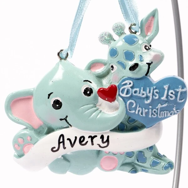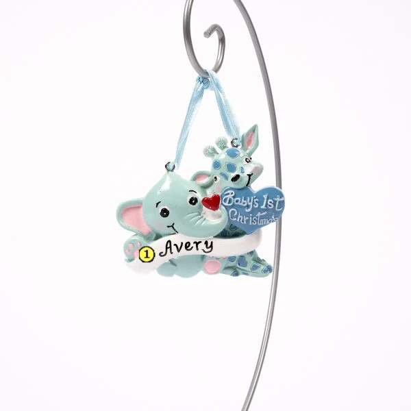 Kurt Adler’s “Baby’s 1st Christmas” boy elephant and giraffe ornament is a festive addition to any holiday décor or Christmas tree. This blue and white ornament features an elephant and giraffe with ample room to personalize,