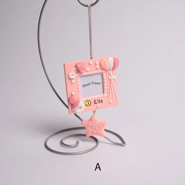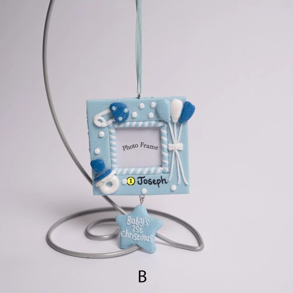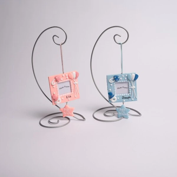 These “Baby’s 1st Christmas” picture frame ornaments are an adorable way to celebrate the little one in your family. Each of these pink and blue glittered picture frame ornaments feature fun details such as a diaper pin, pacifier, balloons and a star dangle (each sold separately). Made of claydough and paper board and measure 5.25in H x .5in W x 3.25in L.