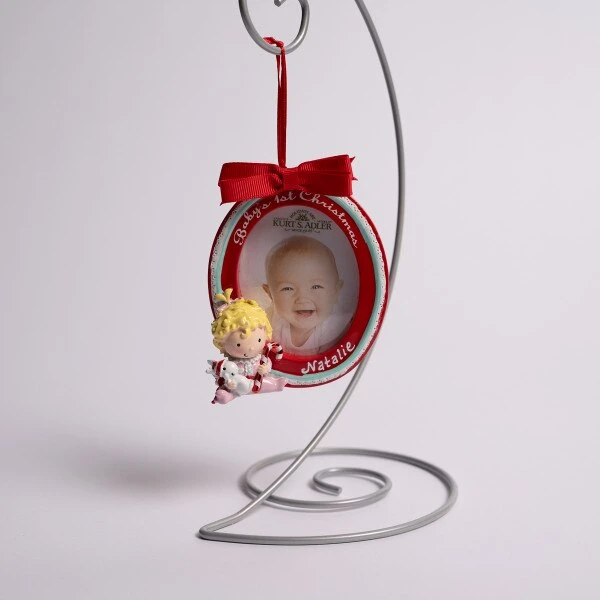 This ornament features a place to put a photo of your baby, and the words “Baby’s First Christmas” at the top. It can be personalized and measures 4 inches in height.