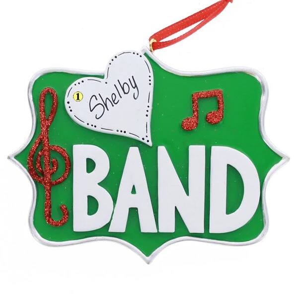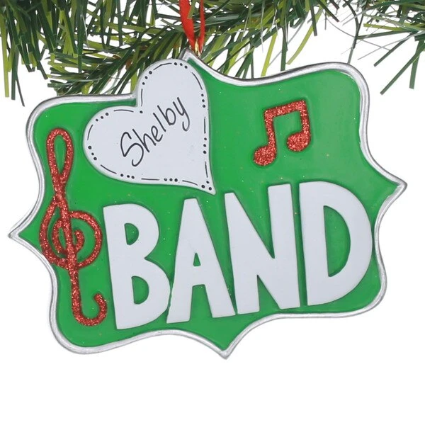 Bright green ornament adorned with a treble clef in red glitter and “BAND” in white lettering and a white heart. Personalization available on this resin ornament that measures 4.5 x .25 x 4.5 inches and weighs .19 pounds.