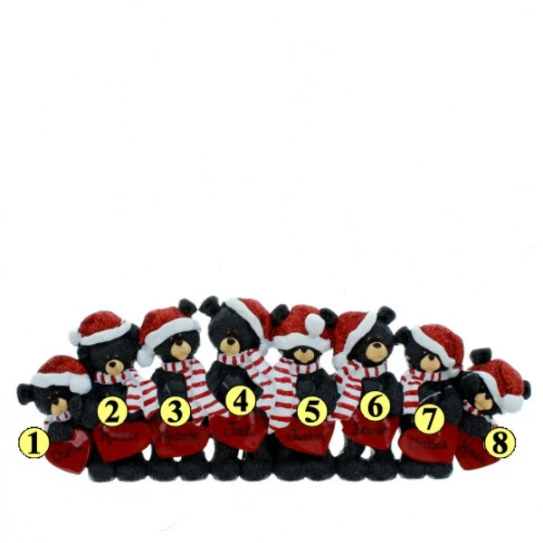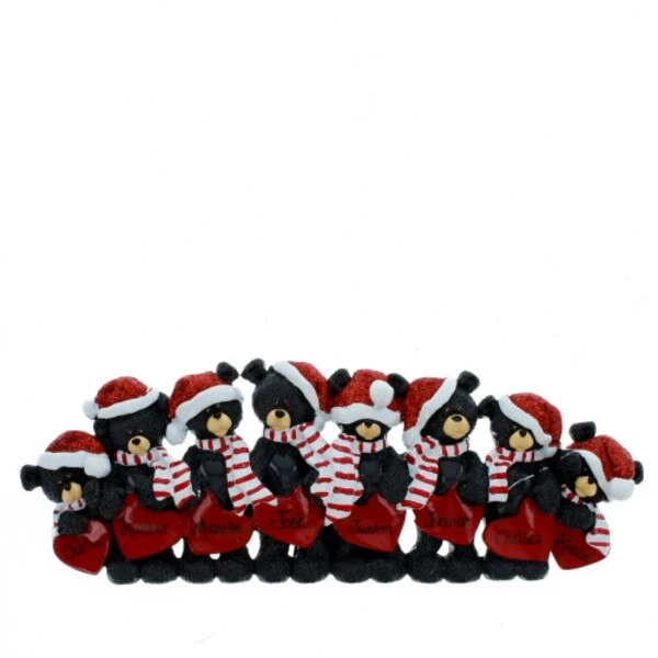 This personalizable standing ornament features a family of black bears and has an easel stand.Â