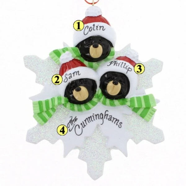 A personalized ornament of a family of three black bears on a snowflake wearing their Santa hats and green scarves.Â