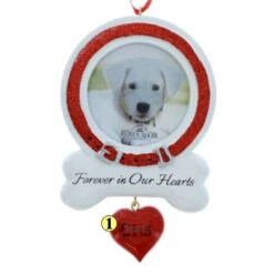 Celebrate the life of your pet with Kurt Adler’s “Forever In Our Hearts” picture frame ornament. This beautiful ornament features a round picture frame with a red glittered collar border, a white dog bone and a dangle heart. Made from quality resin and can be personalized.