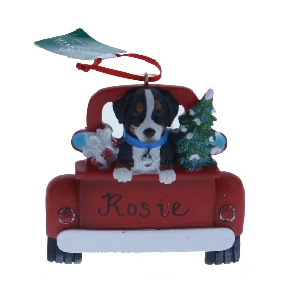 For all of the Bernese Mountain Dog lovers, this ornament is perfect for you. It features a black, white and brown Bernese Mountain Dog in the back of a red truck with a glittered Christmas tree and present.