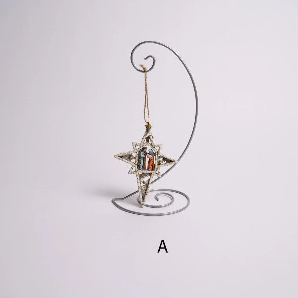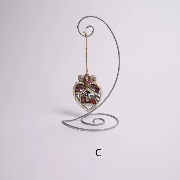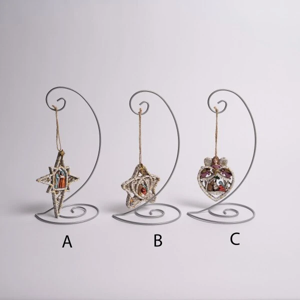 These heart, star and Bethlehem start shaped ornaments feature the Holy family, angels, shepherds and glittered stars. Each sold separately and measure 5.5 inches in height.