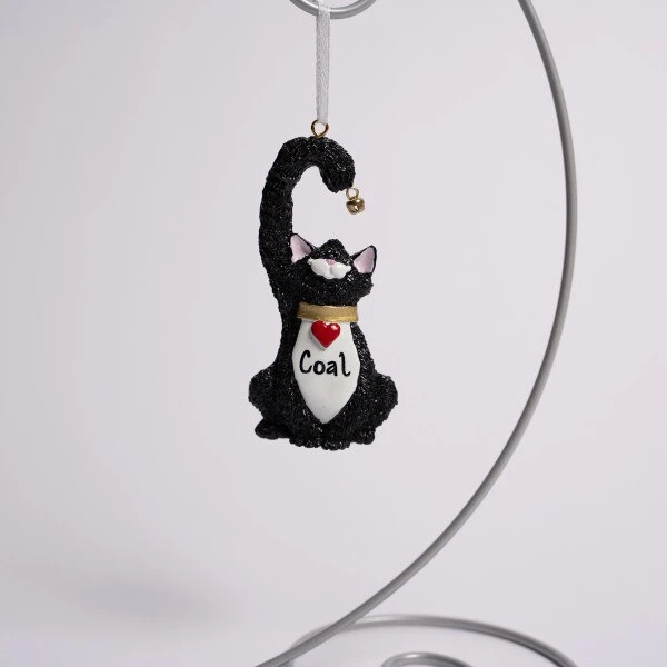 This ornament features a black cat with a heart on its collar and a bell on its tail. It can be personalized and measures 4 inches in height.