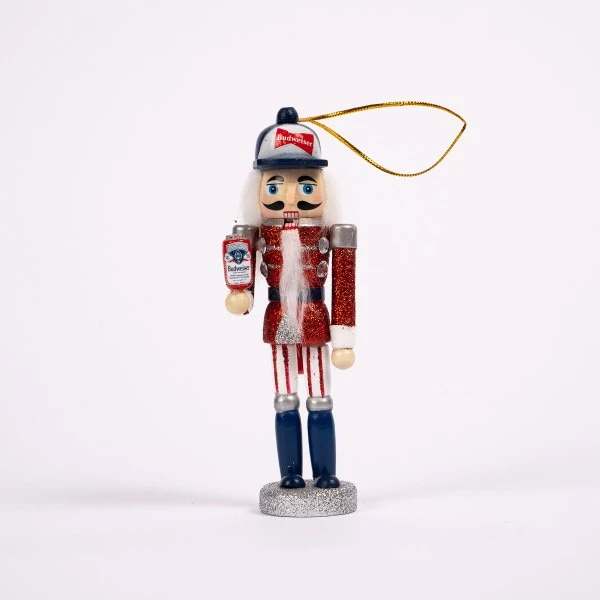 This ornament features a nutcracker wearing a Budweiser hat and holding a Budweiser can in his hand. It measures 5.5 inches in height.