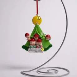 This ornament features a family of 5 enjoying the great outdoors while camping. It can be personalized and measures 4.25 inches in height.